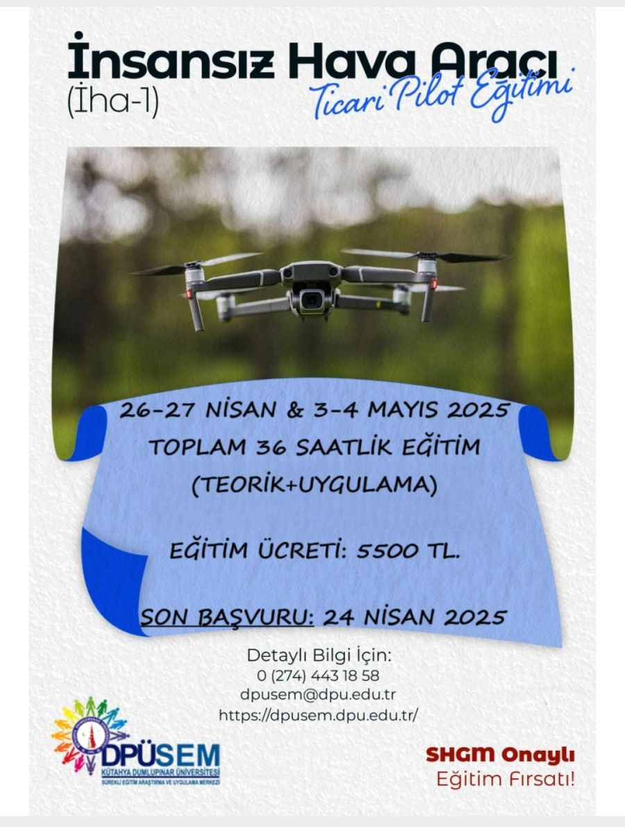 Sürekli Eğitim Uygulama ve Araştırma Merkezi tarafından İnsansız Hava Aracı (İHA-1) Ticari Pilot Eğitimi düzenlenecektir.